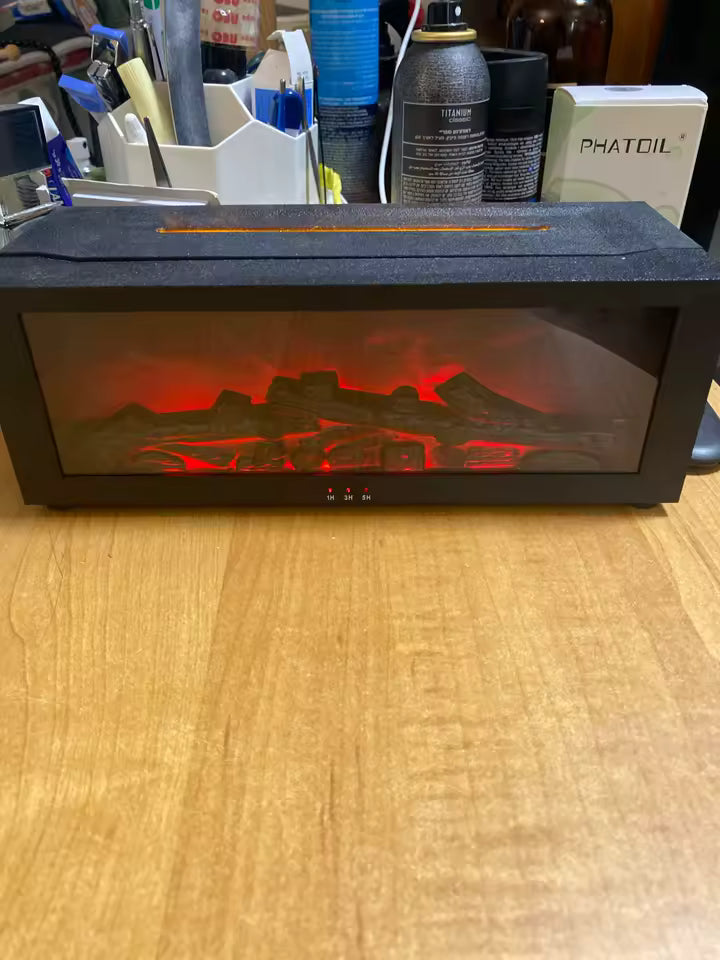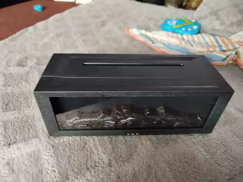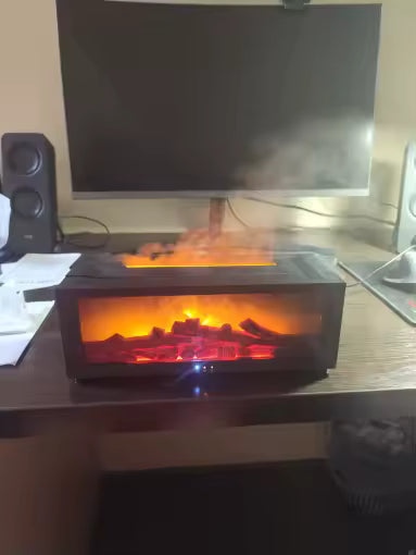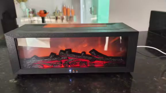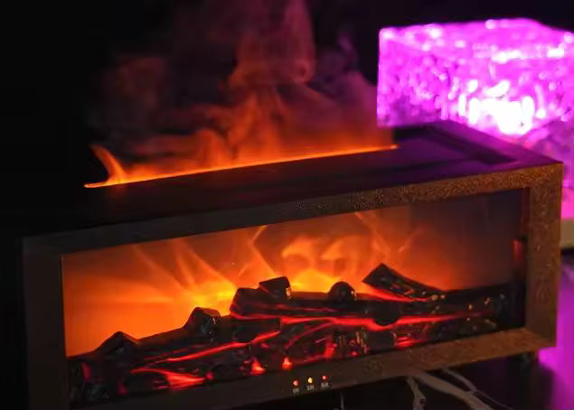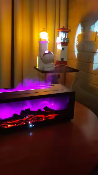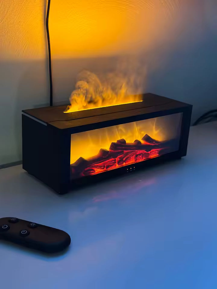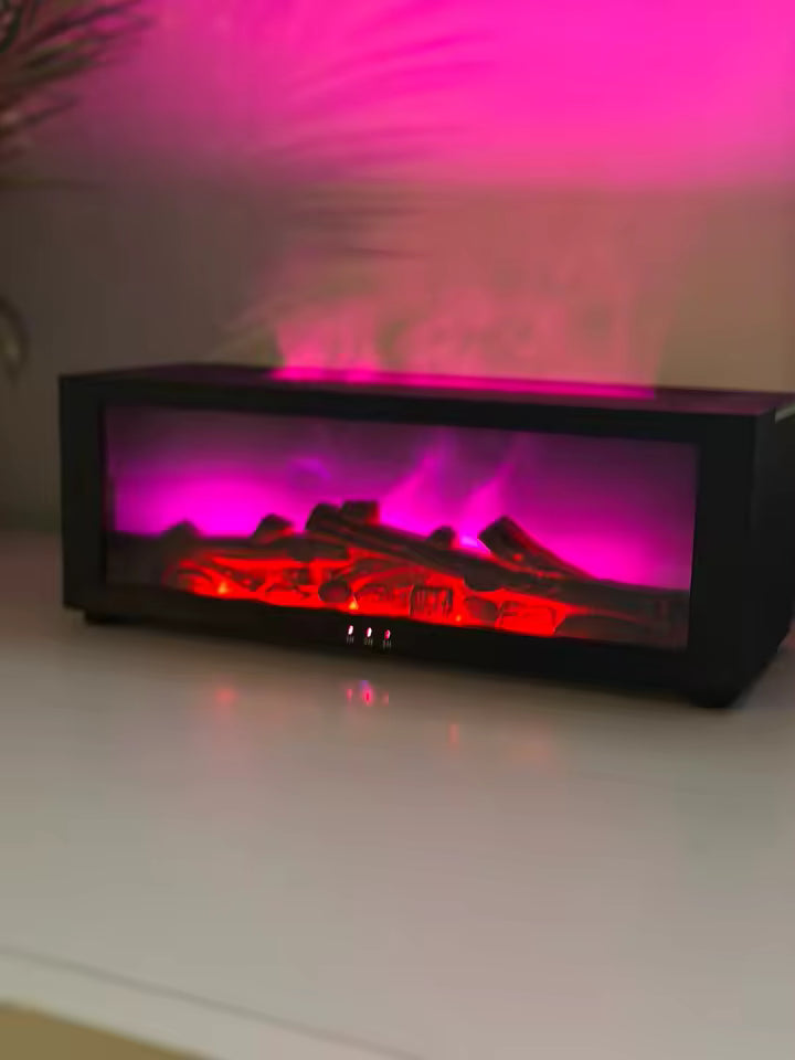 Efekt „płomienia” LED rzuca ciepłe światło na ścianę, delikatna mgiełka nawilża powietrze i w kilka minut czujesz różnicę: skóra mniej napieta, atmosfera cieplejsza, spokój wraca.